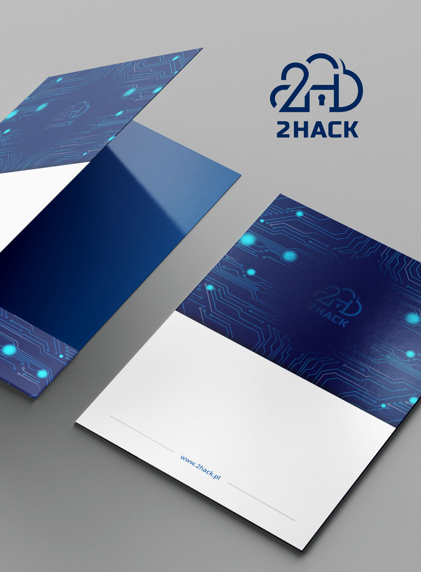 Logo, wizytówka, teczka dla firmy 2HACK z branży IT. Projekt wygrał konkurs na Designer.pl w 2022 roku.
