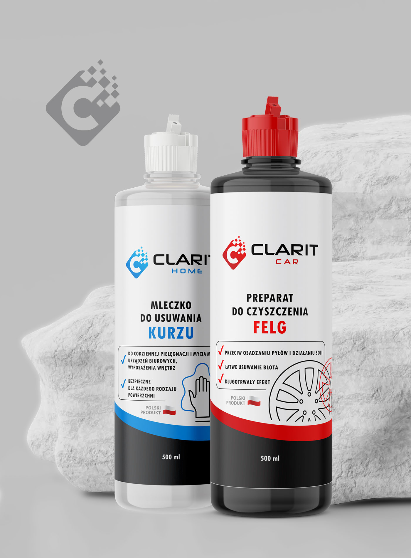 Clarit HomeClarit Car – nazwa, logotyp i projekty etykiet dla linii produktów do sprzątania i do detailingu. Projekt wygrał konkurs na portalu Designer.pl w 2021 roku.
