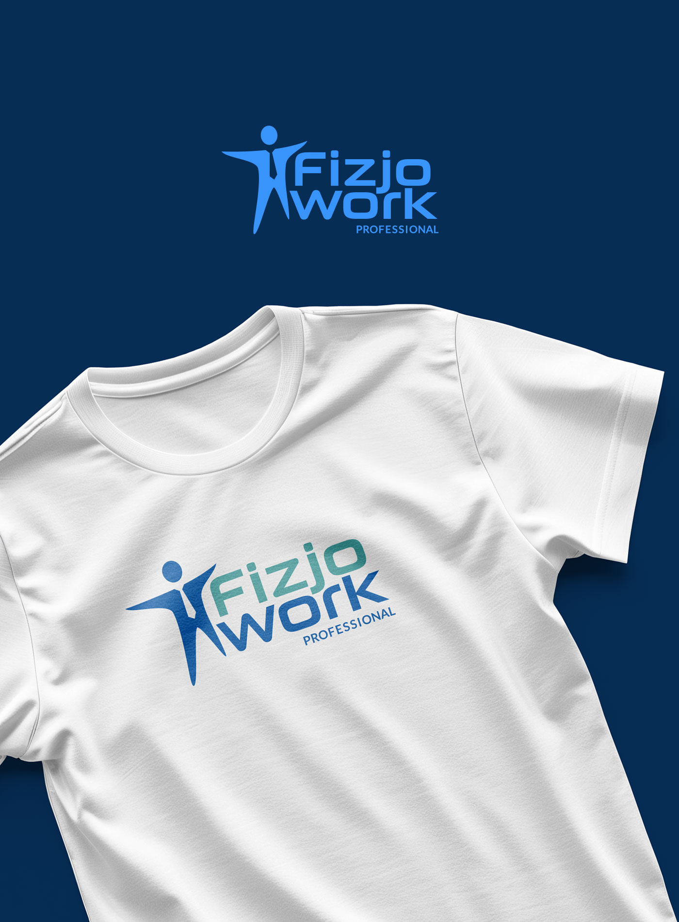 Logotyp FizjoWork i koszulka z nadrukiem dla rehabilitantów. Firma świadczy kompleksowe usługi przygotowania ergonomii miejsca pracy i rehabilitacji pracowników.