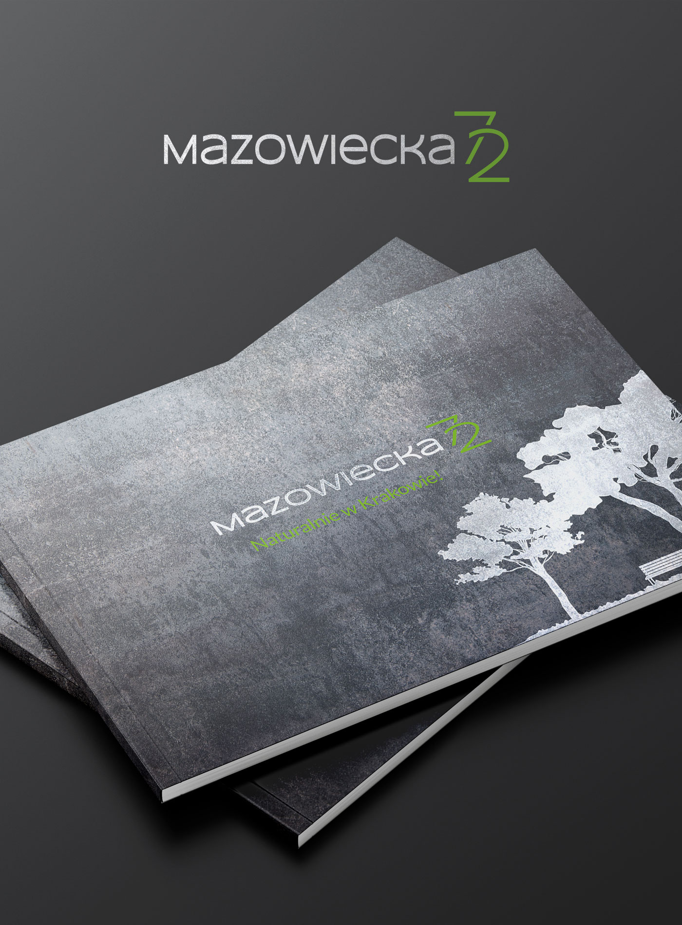 Logotyp, claim oraz okładka folderu promocyjnego inwestycji mieszkaniowej Mazowiecka 72 w Krakowie. Klient: GEO Grupa Deweloperska. Wdrożenie projektów: 2018 rok.
