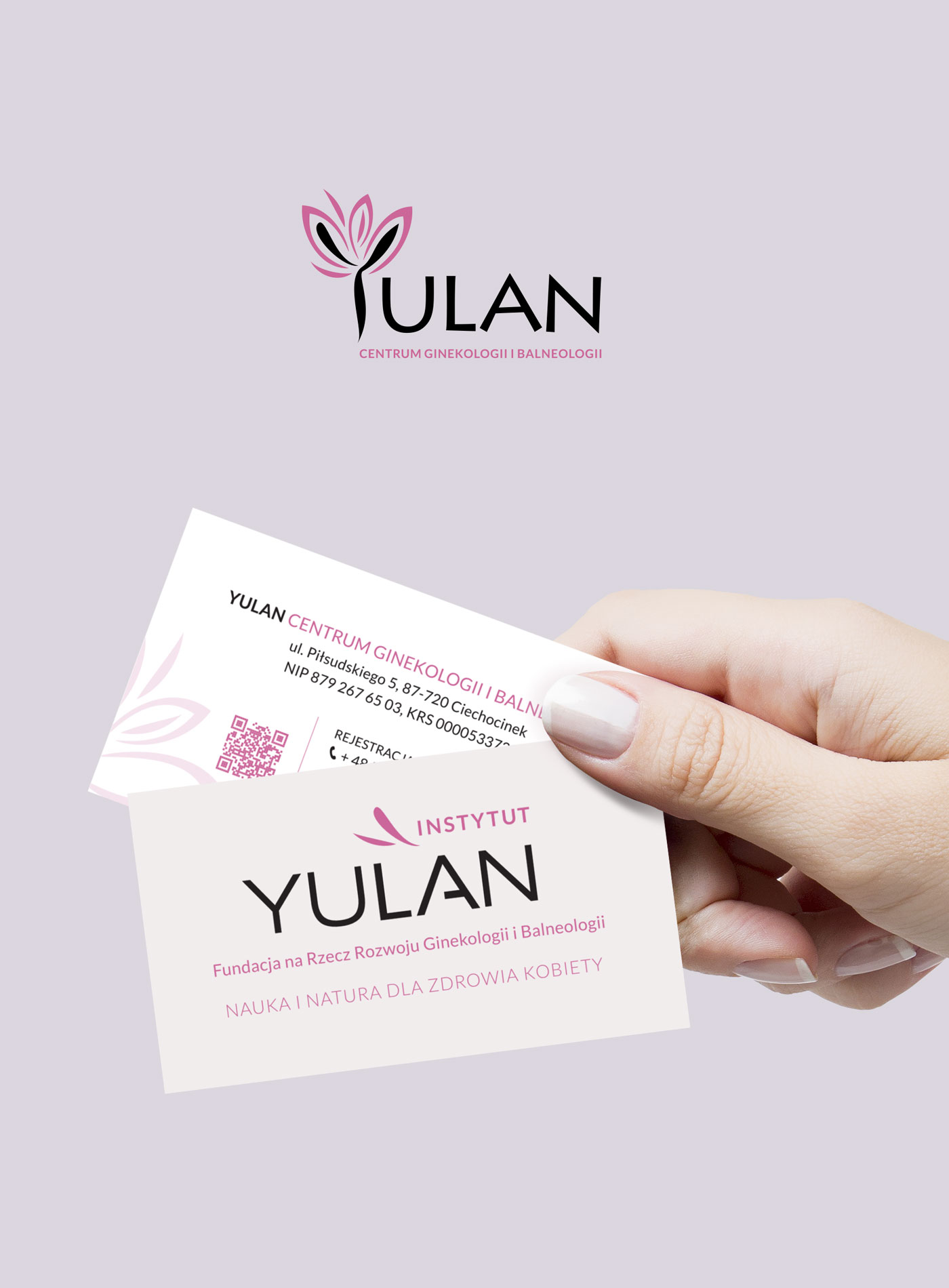 Logotyp i materiały firmowe dla Centrum Ginekologii YULAN w Ciechocinku oraz dla fundacji INSTYTUT YULAN – wygrana w konkursie na portalu Fajnelogo.pl w 2020 roku.