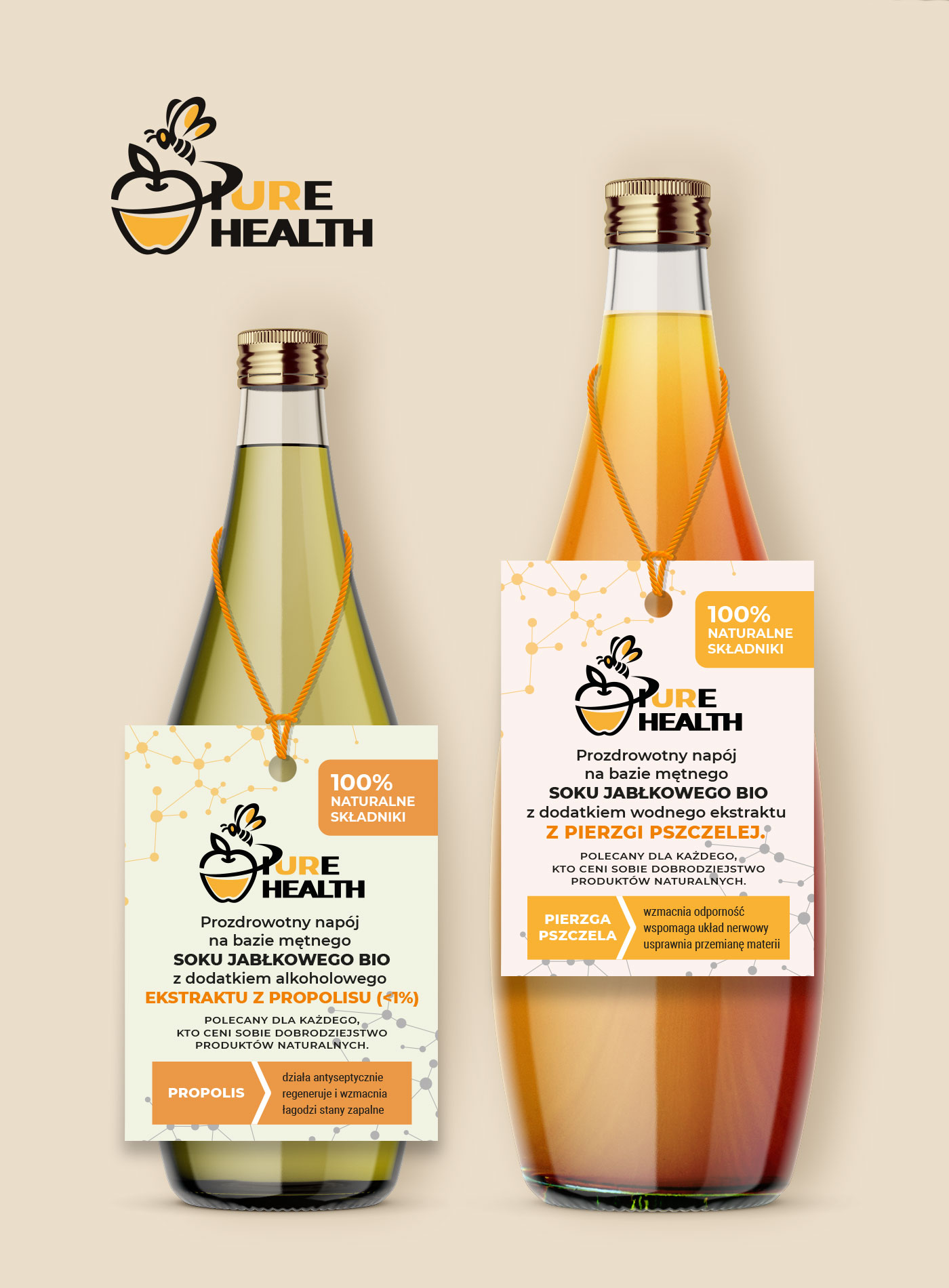 Logotyp i etykiety dla napojów PureHealth, stworzonych w ramach projektu Uniwersytetu Rolniczego w Krakowie. Wygrana w konkursie na portalu Designer.pl w 2023 roku.