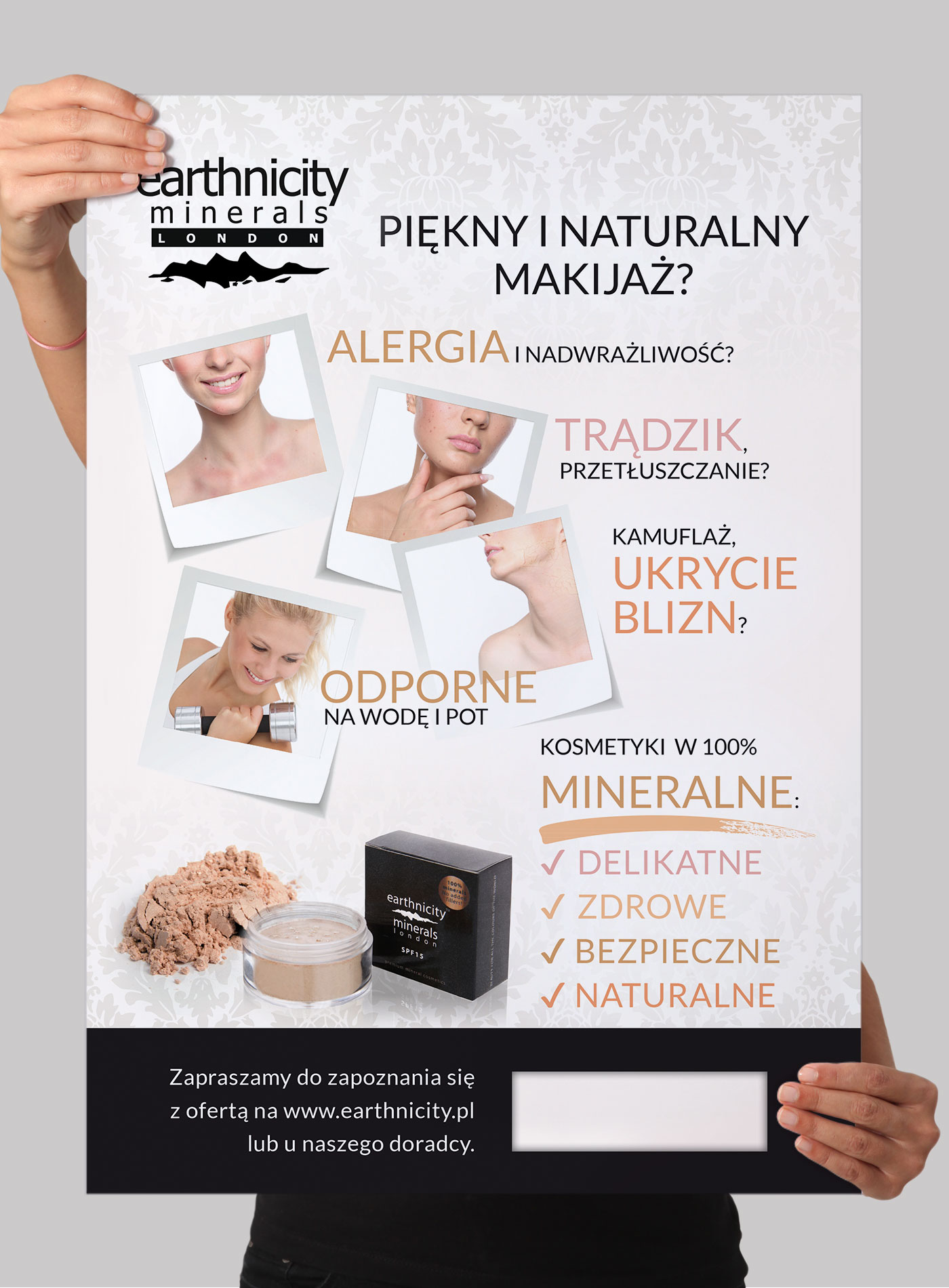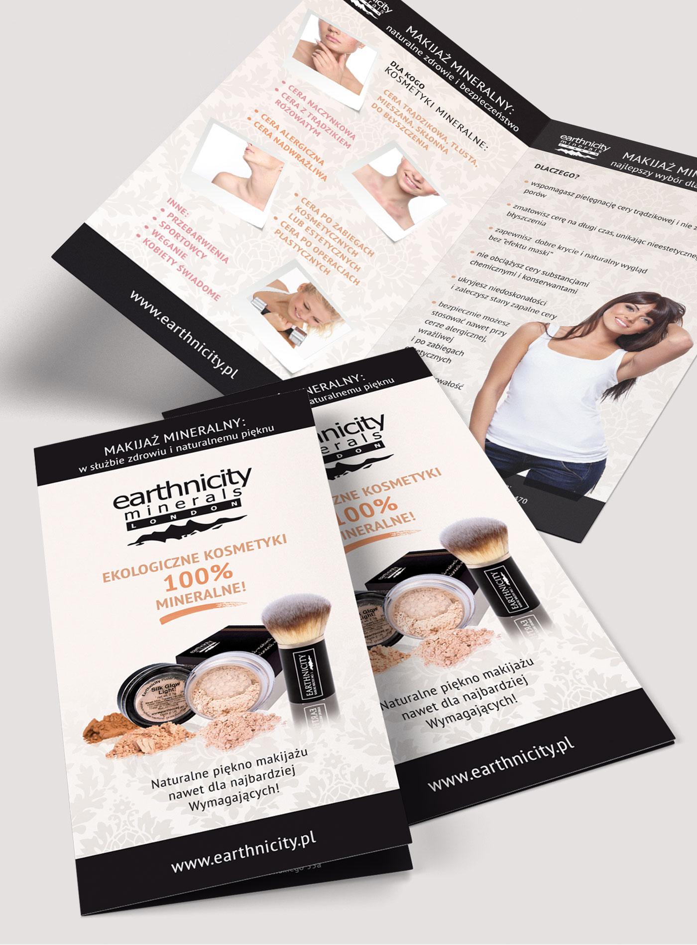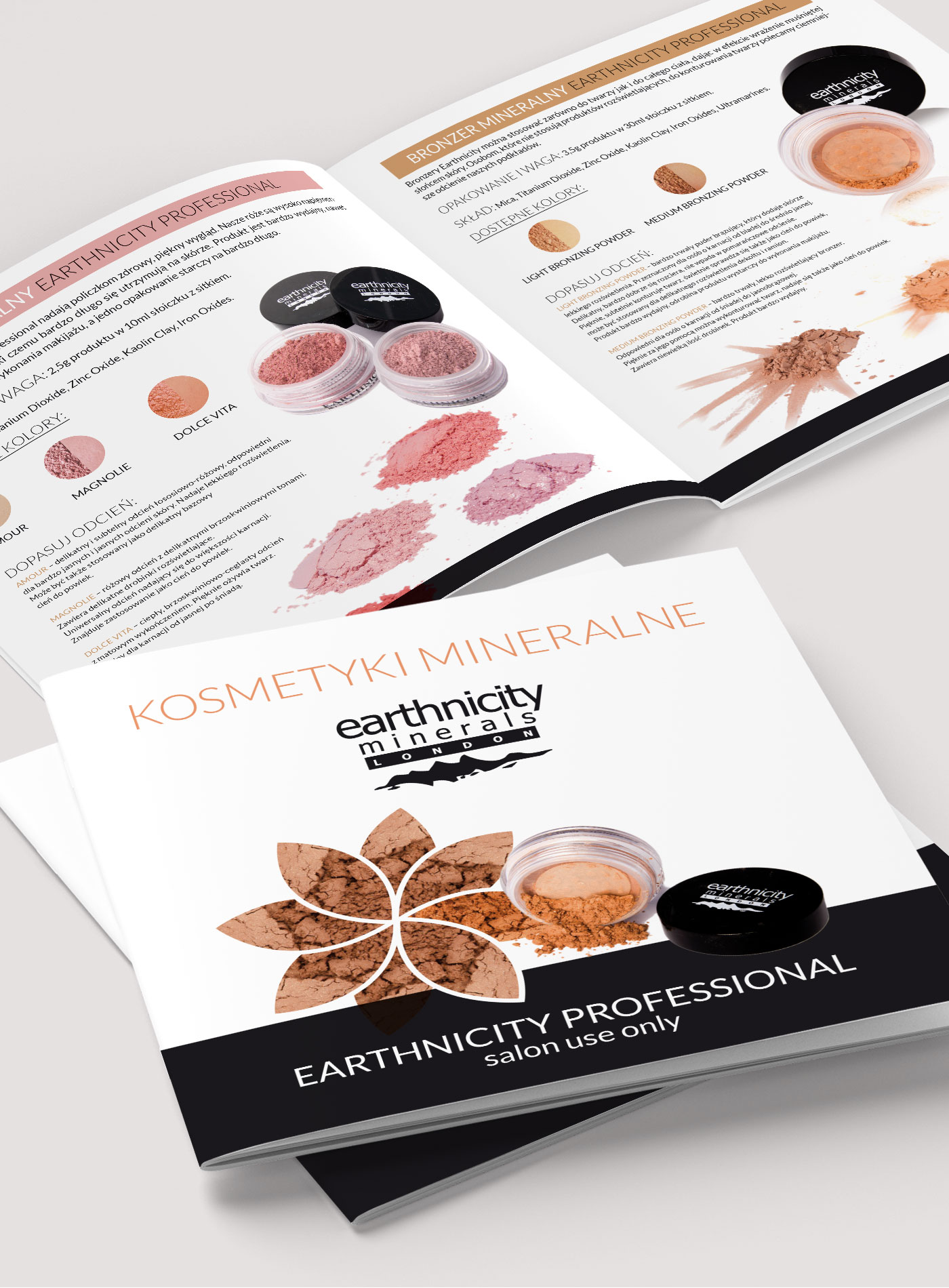 Folder produktowy dla marki Earthnicity Minerals London.Plakat dla marki Earthnicity Minerals London. Pomysł, projekt, fotomontaż, DTP.