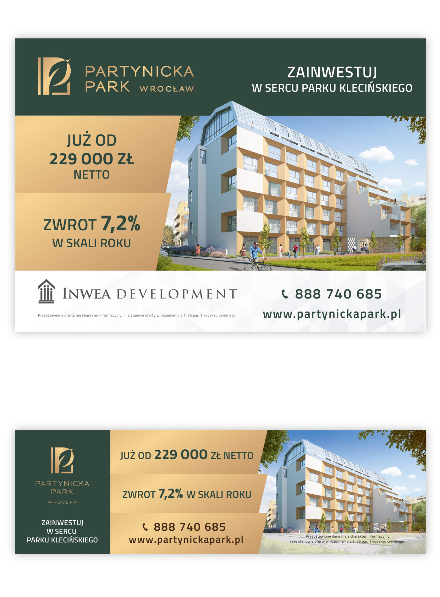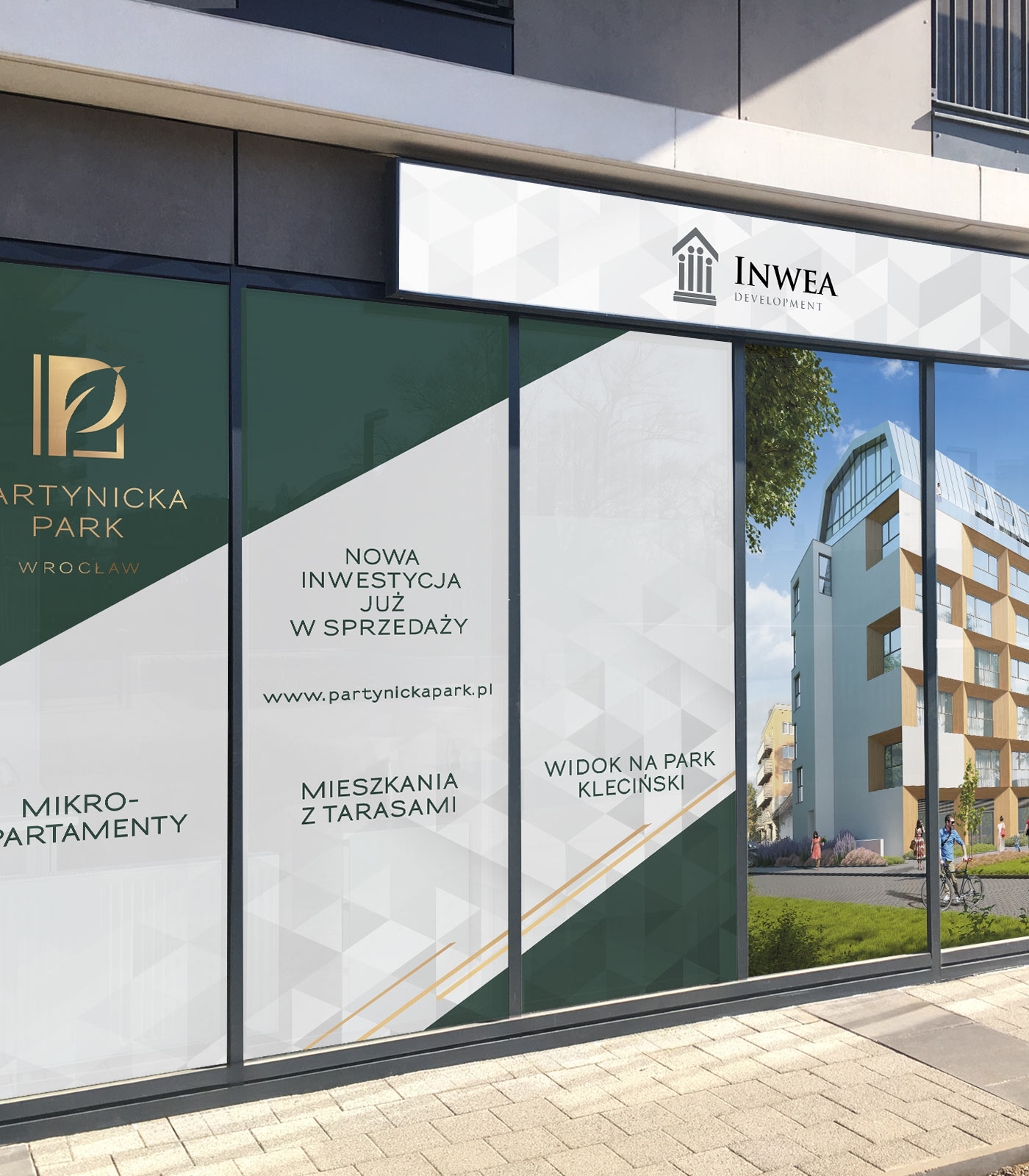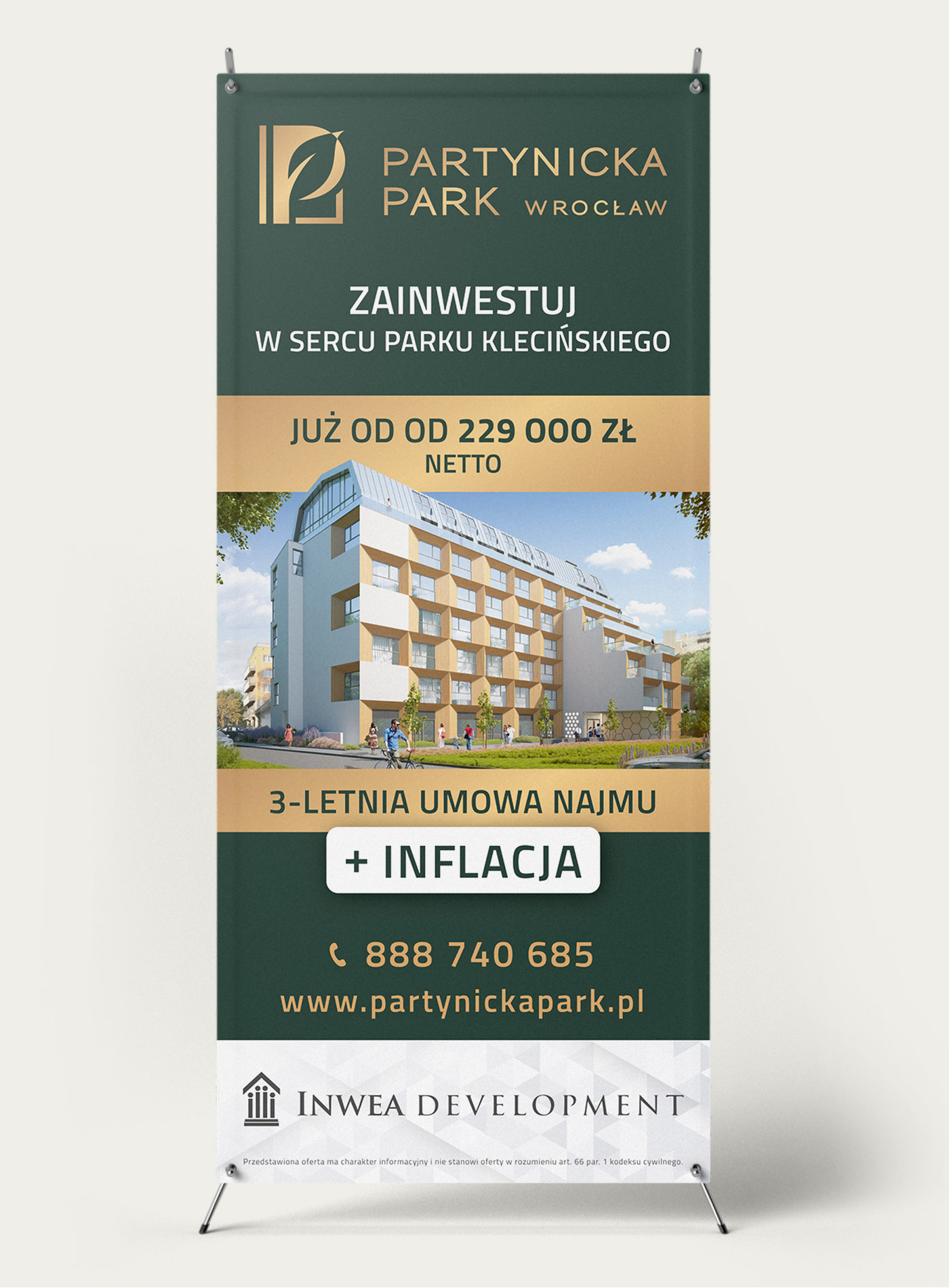 Banner pionowy Partynicka Park we Wrocławiu. Pomysł, projekt, DTP. Klient: Inwea Dewelopment.Reklamy w różnych formatach do magazynu Forbes. Złote moduły nawiązują do charakterystycznych elementów elewacji budynku.Rozbudowane stoisko targowe dla Partynicka Park. Wielopłaszczyznowe stoisko „półotwarte” było wymagającym projektem ale pozwalało podkreślić wiele atutów inwestycji…Zaprojektowałam także „oklejenie” biura inwestycji przy ulicy Kurkowej…