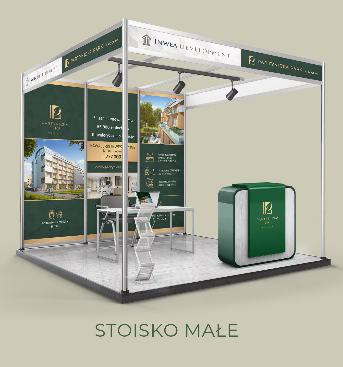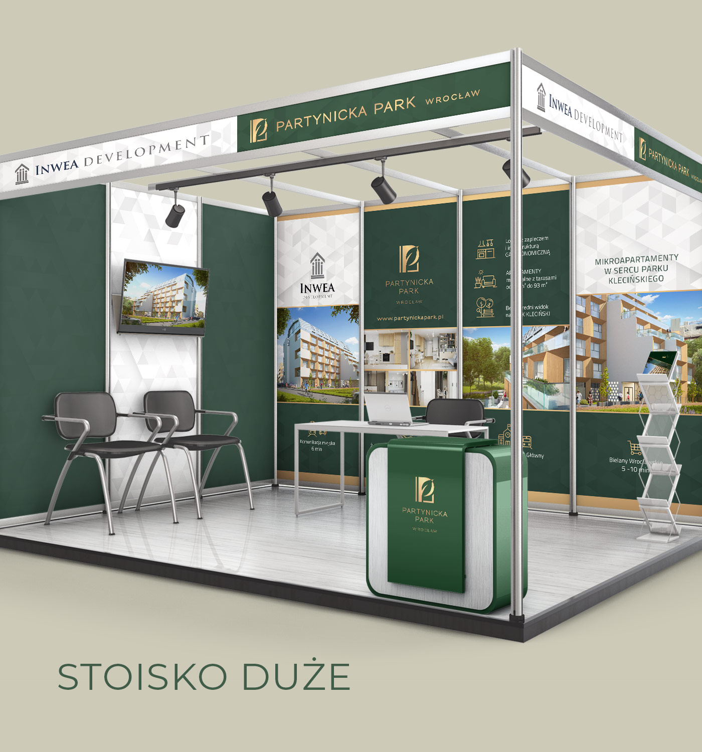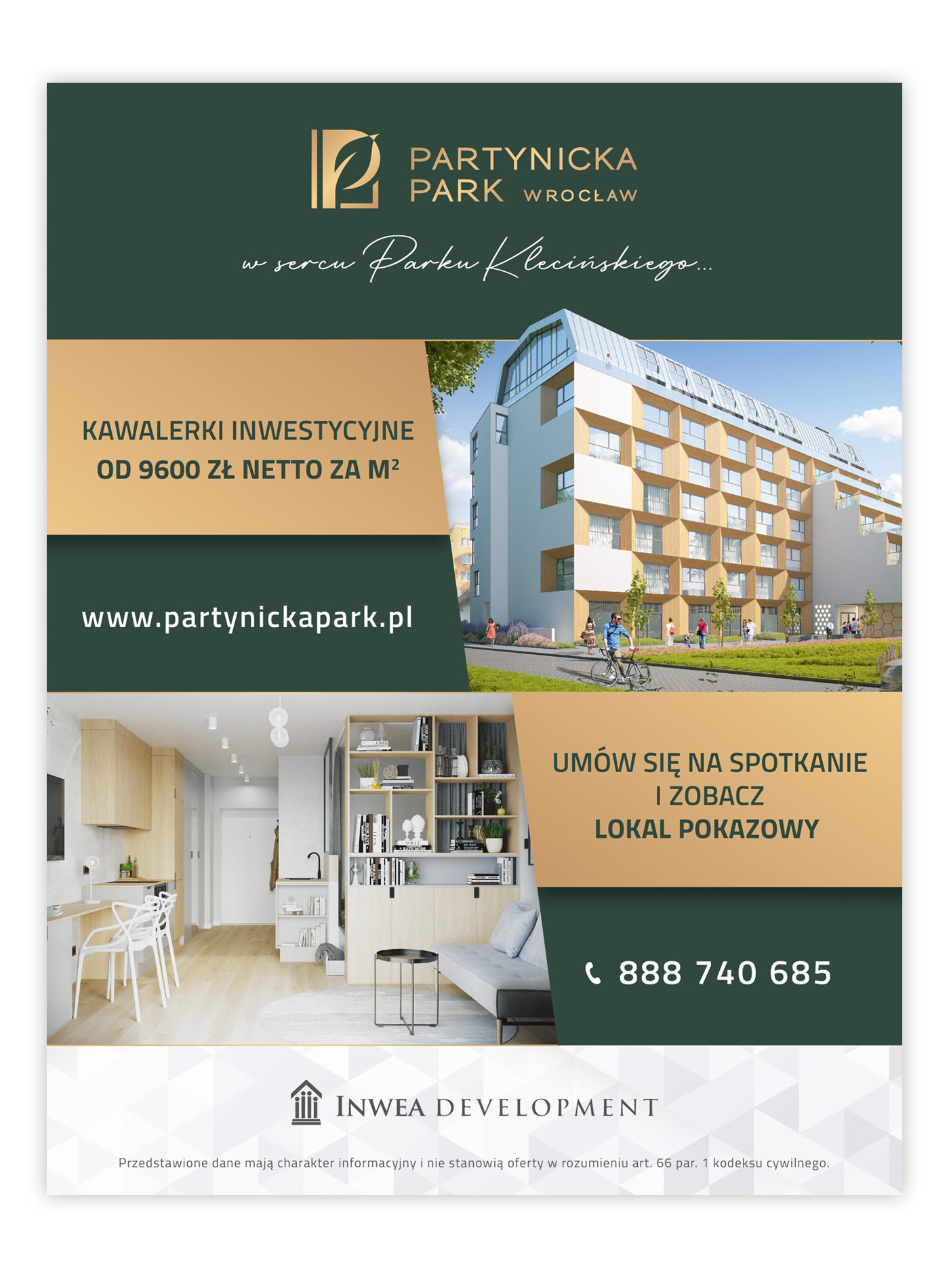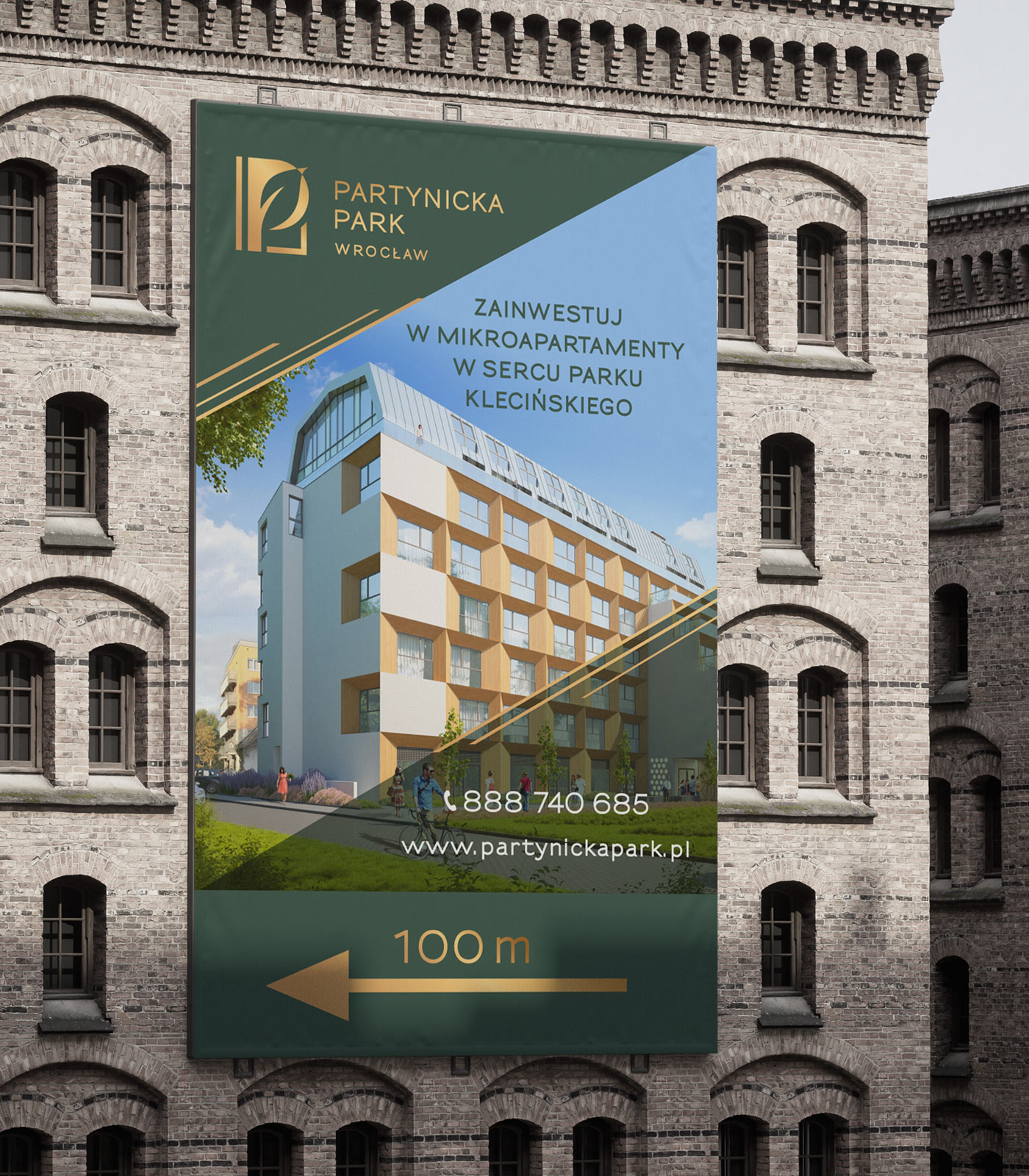 Banner pionowy Partynicka Park we Wrocławiu. Pomysł, projekt, DTP. Klient: Inwea Dewelopment.Reklamy w różnych formatach do magazynu Forbes. Złote moduły nawiązują do charakterystycznych elementów elewacji budynku.Rozbudowane stoisko targowe dla Partynicka Park. Wielopłaszczyznowe stoisko „półotwarte” było wymagającym projektem ale pozwalało podkreślić wiele atutów inwestycji…Zaprojektowałam także „oklejenie” biura inwestycji przy ulicy Kurkowej…