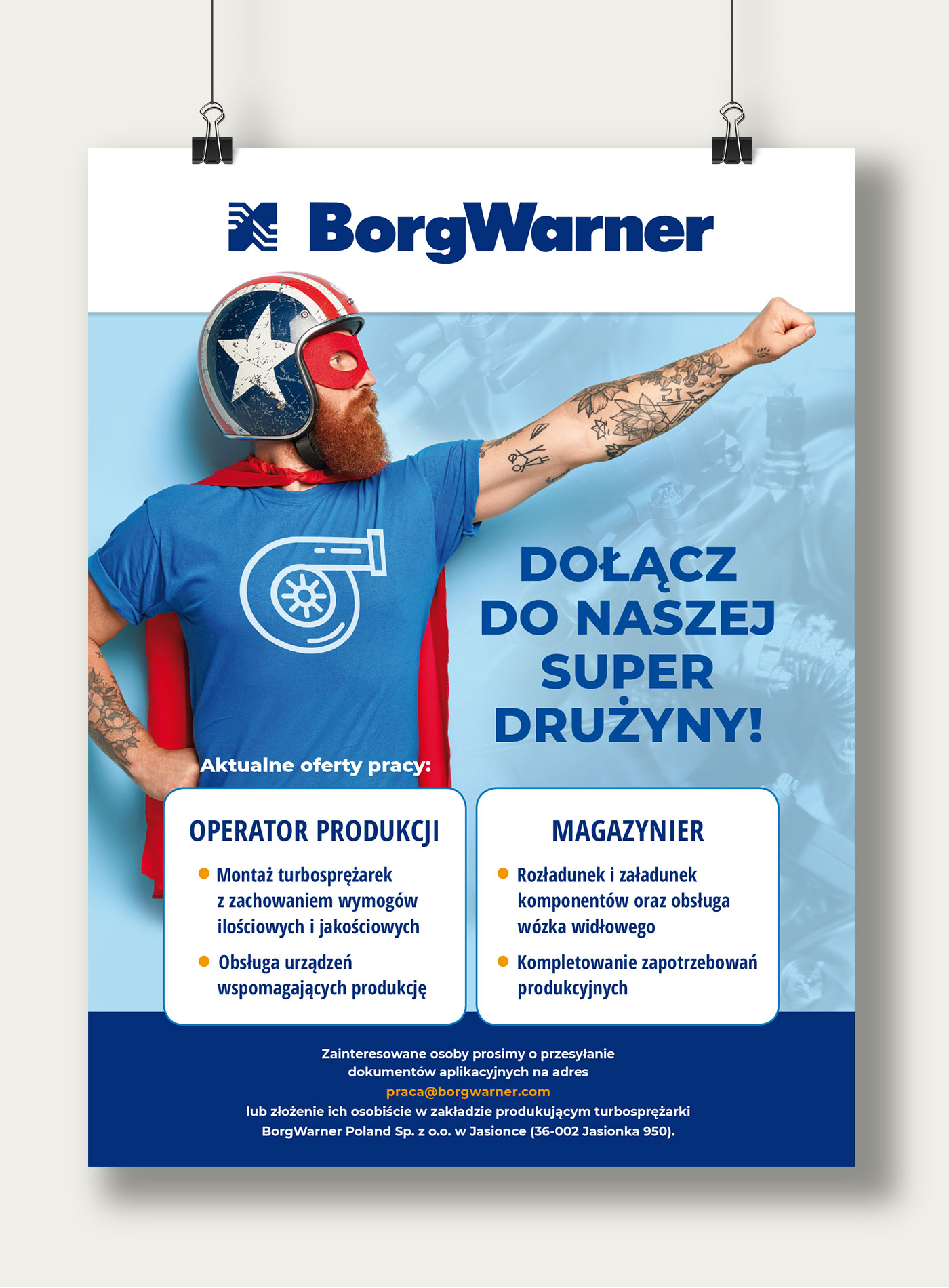 Plakat rekrutacyjny i claim dla BorgWarner Polska. Pomysł, projekt, fotomontaż, DTP. Wygrana w konkursie na portalu Designer.pl w 2022 roku.