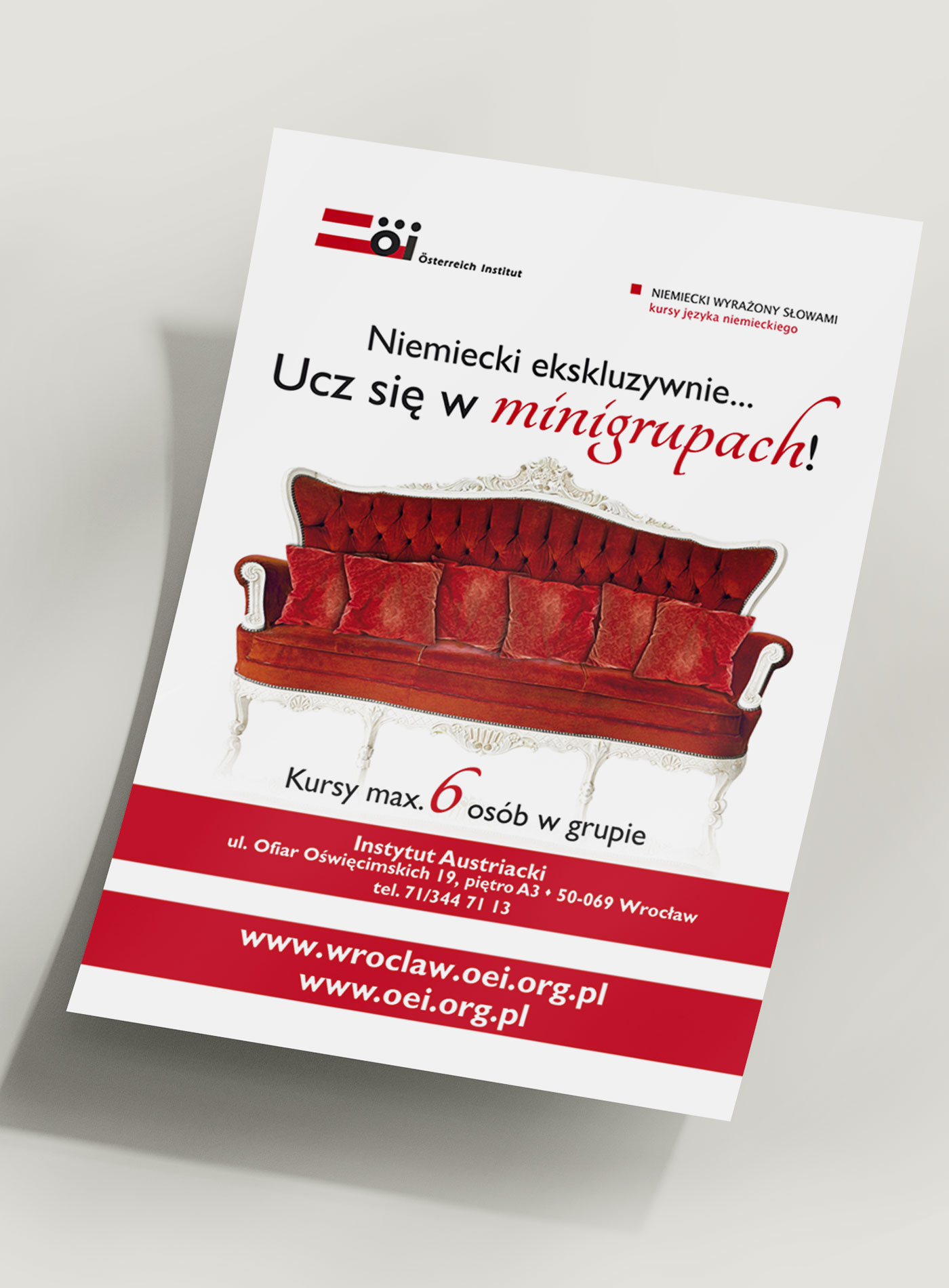 Ulotka promująca kursy językowe – pomysł, projekt, fotomontaż, DTP. Klient: Instytut Austriacki we Wrocławiu.